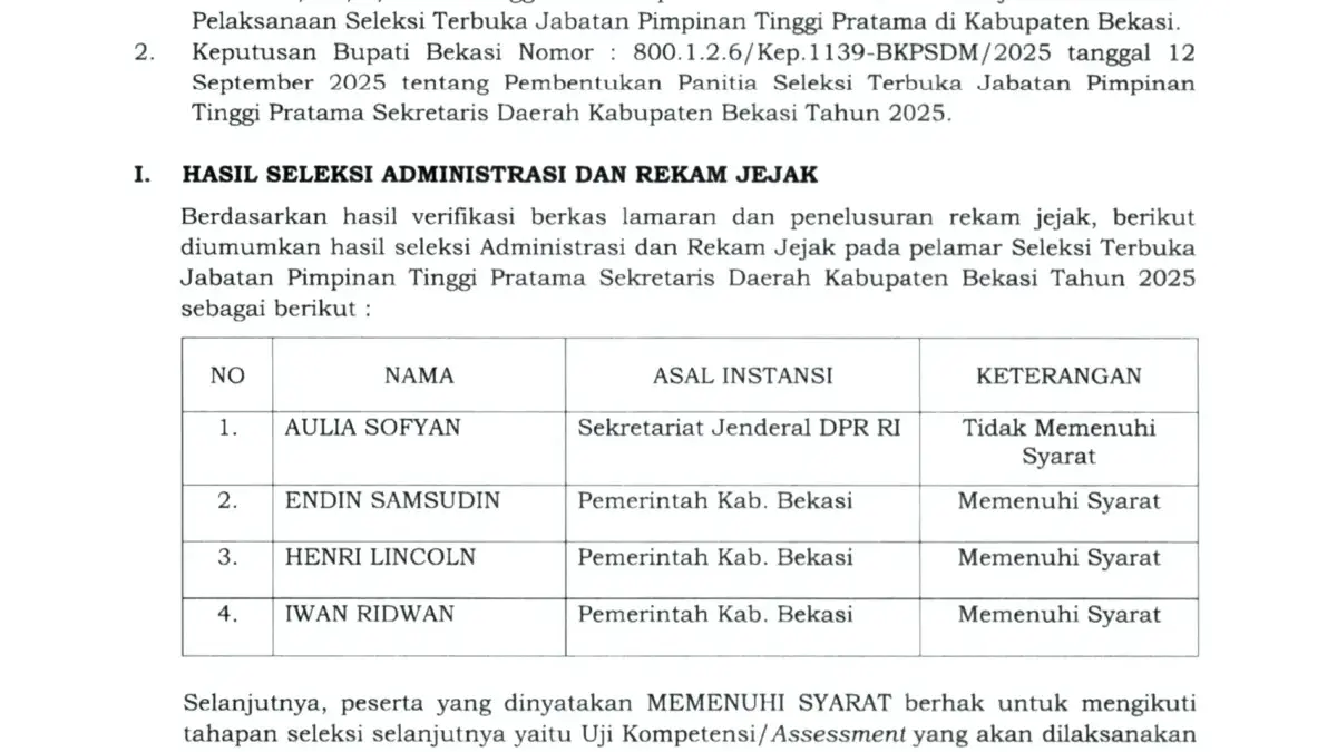Ketiganya adalah Endin Samsudin, Henri Lincoln, dan Iwan Ridwan, yang seluruhnya berasal dari lingkungan Pemerintah Kabupaten Bekasi. Sementara satu peserta lainnya, Aulia Sofyan dari Sekretariat Jenderal DPR RI, dinyatakan tidak memenuhi syarat.